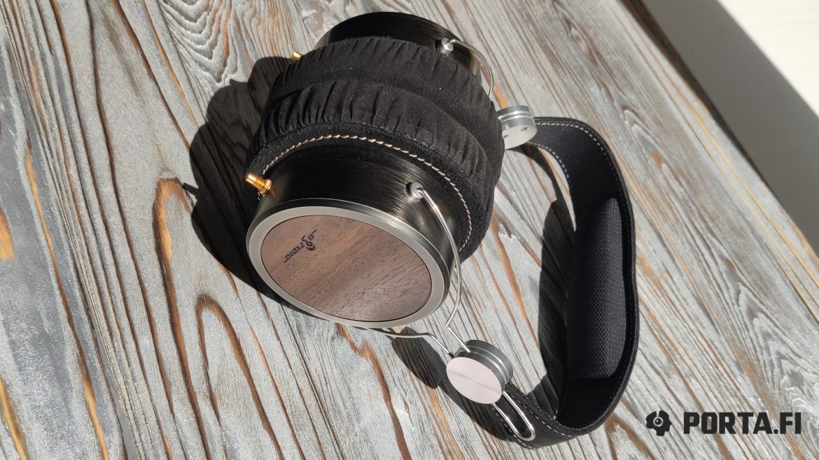 Ear cups are made of metal. Outer part is covered with wood and carved company logo in it. Looks striking and stylish. The only downsides to such approach is that metal is easily scratched. But even this looks charming.